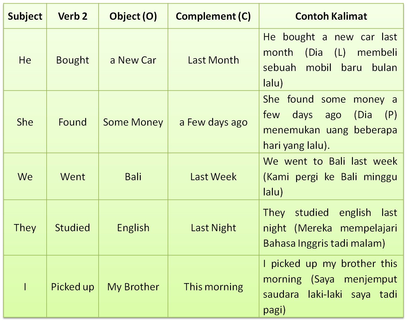 (lisa tidur di tempat ini semalam.) Berikut ini adalah contoh kalimat tenses dan artinya: I was here last night (semalam saya ada disini) we were late yesterday (kami semua terlambat kemarin) he was not happy because of me (dia tadi tidak senang karena saya) they were not home last night (mereka tidak ada di rumah tadi malam) was she pretty? S + v1 (subyek + verb 1) contoh 1: (bola itu bundar) baca juga: